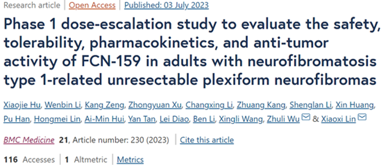 2. Hu X, et al. Phase 1 dose-escalation study to evaluate the safety, tolerability, pharmacokinetics, and anti-tumor activity of FCN-159 in adults with neurofibromatosis type 1-related unresectable plexiform neurofibromas. BMC Med. 2023 Jul 3;21(1):230. doi: 10.1186/s12916-023-02927-2.